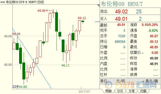 布伦特原油已突破阻力位48.89美元,料进一步涨至每桶49.54美元。