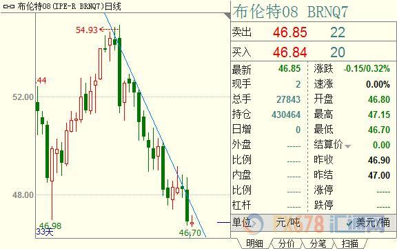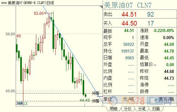 截至发稿,' 美国原油交投于44.60' 美元/桶,小幅下跌0.27%;布伦特原油换手于46.95美元/桶,小幅走弱0.11%。