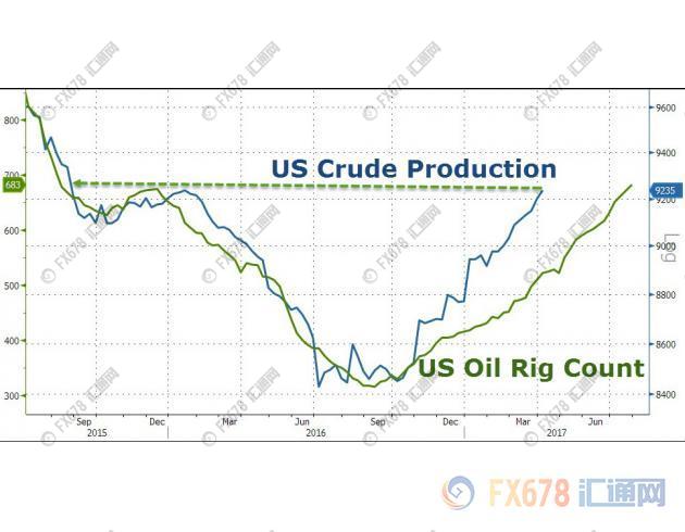 知名金融博客零对冲表示,美国石油钻井录得连续13周增加,这是2015年4月以来的新高;同时,美国' 原油产量升至2015年8月以来的最高水平;数据公布后,美油小幅震荡,交投于53.0美元/桶,跌幅0.21%。