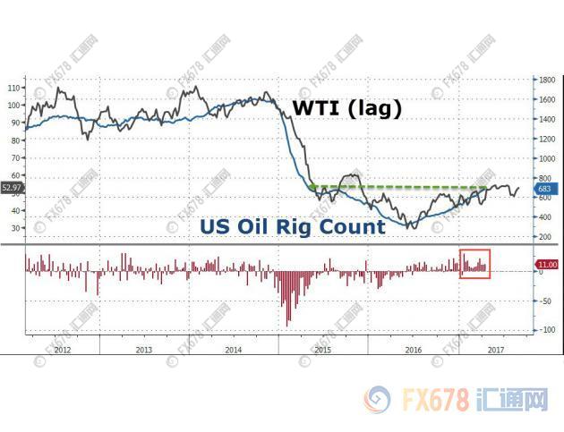 汇通网讯——北京时间4月14日,油服贝克休斯公布的数据显示,美国截至4月13日当周石油钻井总数升至683口,较上周增加11口,连续13周录得增加。数据公布后,油价交投于53美元/桶,日内目前跌幅0.21%。