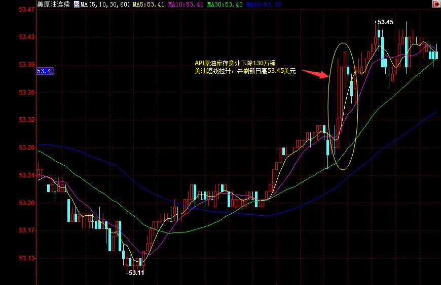 北京时间周三(4月12日)凌晨,' 美国石油学会(API)公布的数据显示,美国截至4月7日当周API' 原油库存减少130万桶至5.324亿桶,预期增加31.6万桶。数据公布后,美油短线拉升并创日内新高,报53.45' 美元/桶。
