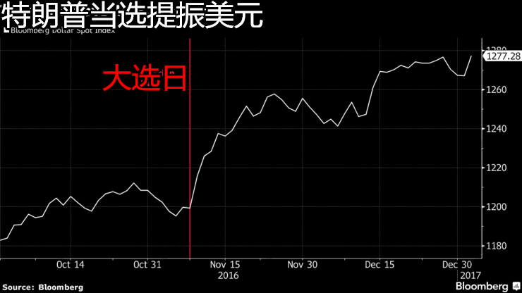 美元能够持续11月8日美元' 大选之后的走势,市场还有待观察。追踪美元兑10种主要货币汇率的彭博美元即期指数自大选以来已经上涨了6.5%,背后推动的因素包括未来美国公司监管的放松,政府开支的增加,税收的减少以及通胀预期的增加。