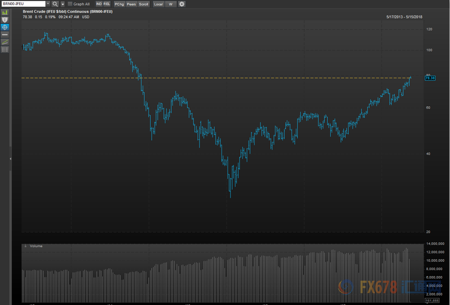 周二(5月15日)盘中,布伦特原油一度冲击80美元关口,触及三年半新高79.47美元。布油价格上一次在80美元/桶附近还是2014年11月27日的时候。当年在这个价位的时候,OPEC拒绝通过限产或者减产的措施来消除原油市场供过于求的状况。正是由于当年OPEC的这个决策,让油价一蹶不振。