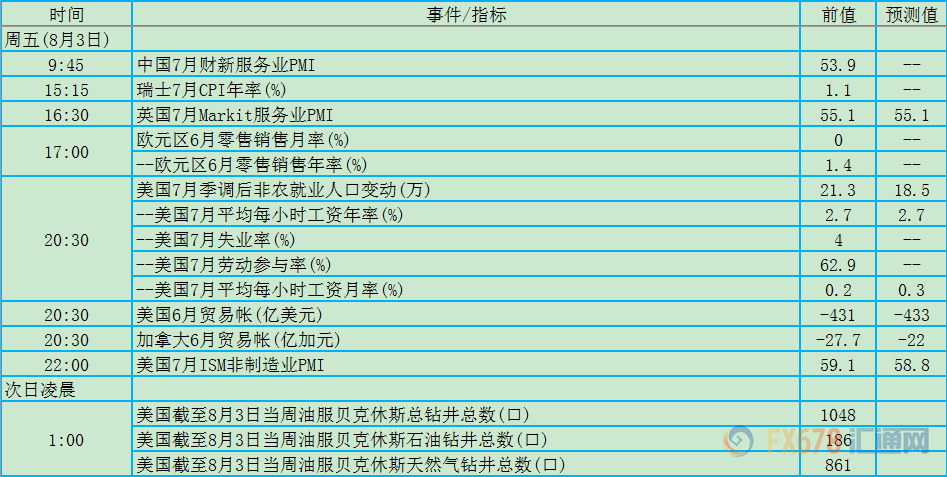 周五(8月3日)关键词:非农、英国服务业PMI、美国贸易帐、加拿大贸易帐