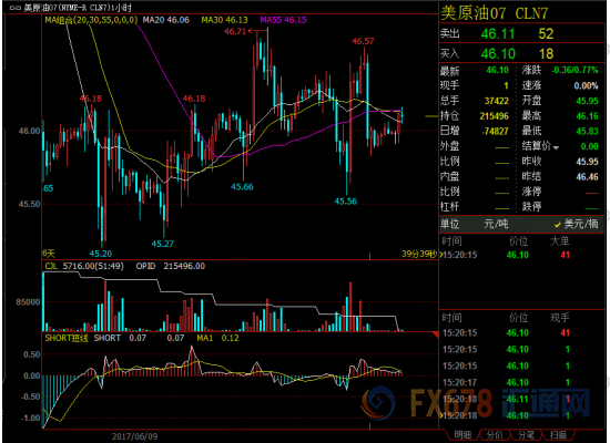 油价延续弱势走势,美国原油7月期货交投于46.10美元/桶附近,跌幅约为0.77%;布伦特原油8月期货交投于48.43美元/桶附近,跌幅约为0.60%。OPEC月报显示OPEC 5月原油产量回升,美国API原油库存意外录得大增以及美国原油出口飙升等因素均令市场对全球原油供给过剩的忧虑情绪加剧,油价因此而承压下跌。