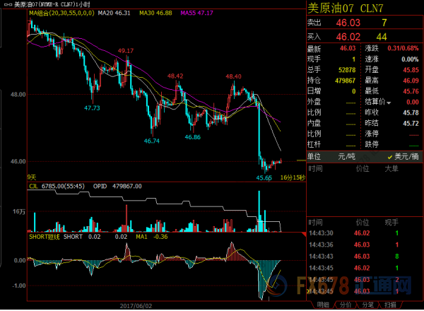 油价自隔夜低位小幅反弹。美国原油7月期货交投于46.06美元/桶附近,涨幅约为0.74%,布伦特原油8月期货交投于48.44美元/桶附近,涨幅约为0.79%。最新公布的美国API和' EIA原油库存报告均为油价带来利空影响,隔夜油价曾一度重挫近5%至一个月低点。油价跌穿46美元后获利的投资者进一步结清空头头寸,扶助油价小幅反弹。