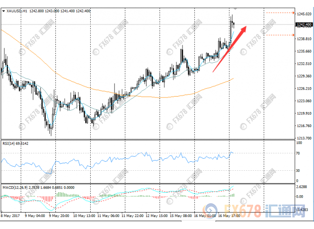 现货黄金已连续四个交易日收升,周三亚市早盘时一度上破1240美元/盎司关口,刷新5月3日以来高位至1245.07美元/盎司。