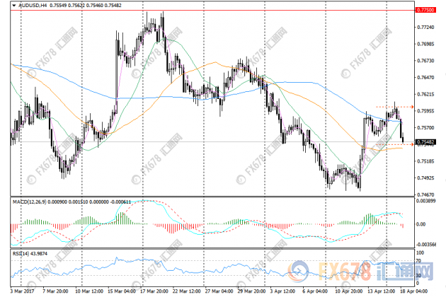 澳元兑美元震荡下跌至0.76关口下方,隔夜曾上破0.76关口、触及两周高位,主要因中国经济增长数据乐观,不过铁矿石价格疲弱令澳元无法稳站该水准上方。