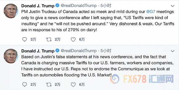 紧接着,特朗普在第二条推特中写道:“加拿大总理特鲁多在七国集团峰会期间表现得非常谦恭、温顺,但却在我离开后的新闻发布会上说,‘美国的关税是种侮辱,他不会任人摆布’。这非常不诚实,是懦弱的表现。我们的关税是对他高达270%奶制品关税的回应。”