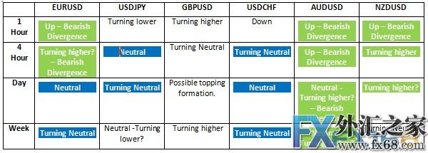 (图片来源:FX Charts、FX168财经网)注:绿色代表可能的买入机会;红色代表可能的卖出机会;蓝色代表可能的区间交易机会。