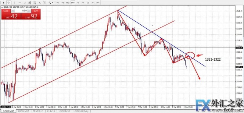 半小时图来看,黄金价格自3月7日跌破图中上升通道后出现强大抛压,目前沿着图中蓝色下降趋势线压力下行,短期走势仍较为疲软,因此今日建议可于反弹趋势线压力位置布局空单。