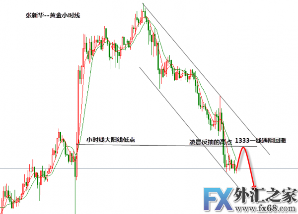 日线收盘在MA均线下方,4小时线在下跌过程中很难出现阳线,小时线凌晨大阴继续下跌,早间窄幅横盘修正,那么日内继续逢高做空为主,凌晨修正的高点在1332一线,前期大阳线的低点在1333.50附近,所以日内反抽1332-33一线将继续遇阻回撤,下方支撑1318-20.