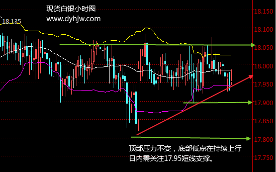 从白银小时图中可以看出,布林带三轨处于明显走平的状态,银价日内在18美元上下波动,日线图上看,底部支撑最低在17.80美元,而在目前多头力量下,银价每次最多触及到18.05美元机会出现大幅回落。白银已经持续了一段时间的震荡行情,如果本周还无法成功破位18美元,下周银价很有可能会因为多头力量的不足而出现持续下跌。