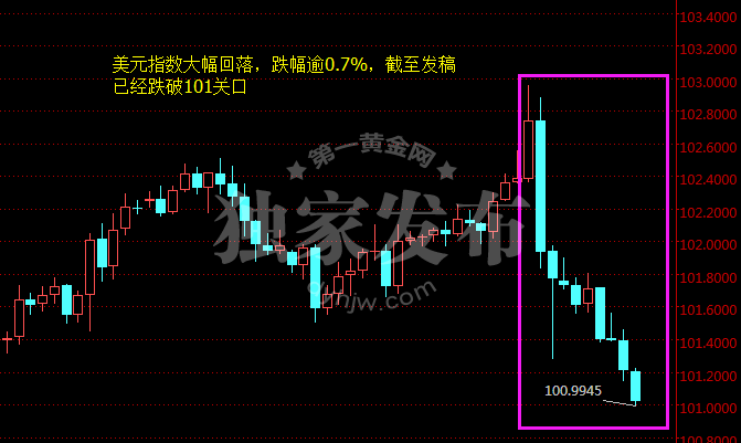 美元指数周四(1月12日)大幅回落,跌幅逾0.7%,截止发稿,美指已经跌破101关口。美指的走低给黄金价格带来一定支撑。