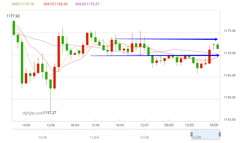第一黄金网12月7日讯 国际黄金总体继续弱势盘整,金价午后下探的一次1165附近,但也很快反弹至1168附近,从目前的走势来看黄金价格仍旧陷入僵局。今日黄金价格早盘维持低位震荡整理,午盘有所拉升,目前金价仍然是反弹无力,晚盘关注区间1175-1165,跟随趋势反弹后继续开空。